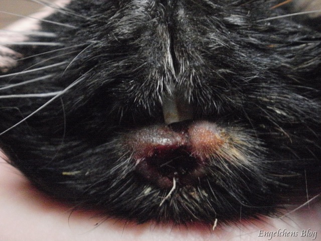 Die Tierärztin hat festgestellt, dass seine unteren Schneidezähne durch die Lippe gebohrt waren.