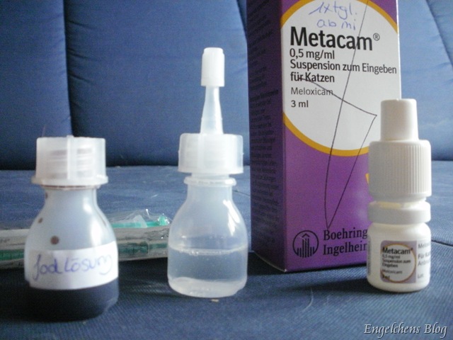 Auf die Wunde hat sie mir einem Wattestäbchen ein wenig Jodlösung getupft und ihm gegen die Schmerzen Metacam gegeben. Davon soll er jetzt 1x täglich 0.1ml bekommen.