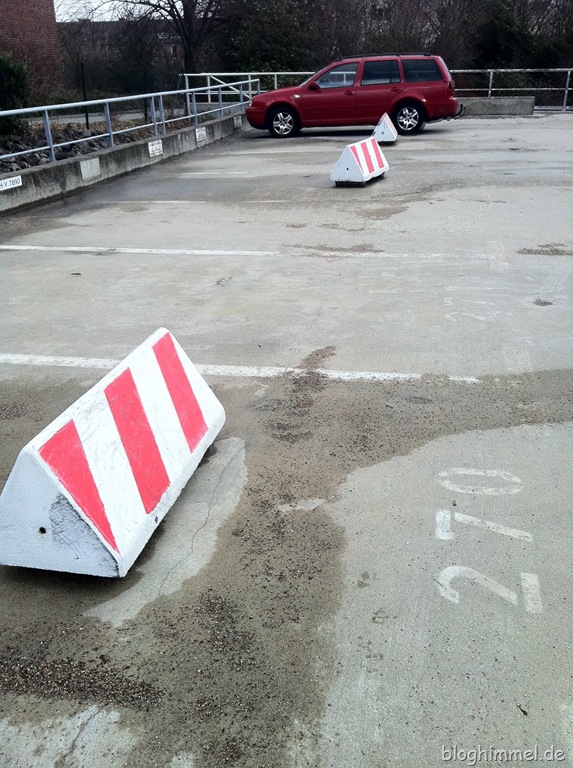 Er befindet sich auf diesem Parkdeck in einem dieser Betonpoller. Davon stehen dort viele herum! Seht ihr die Löcher in der Seite? Darin steckt das kleine schwarze Röhrchen!