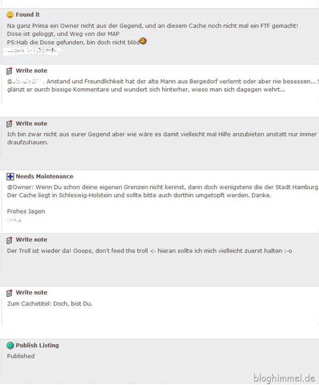 Kurz nachdem der Cache veröffentlicht wurde gab es schon die ersten Einträge. Ein Paar haben den Cache nicht gefunden, sich beschwert dass die Koordinaten falsch sind (Sind wohl 30m weiter in der Botanik) und dass es sich wohl um Privatgelände handelt.